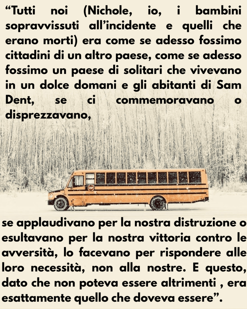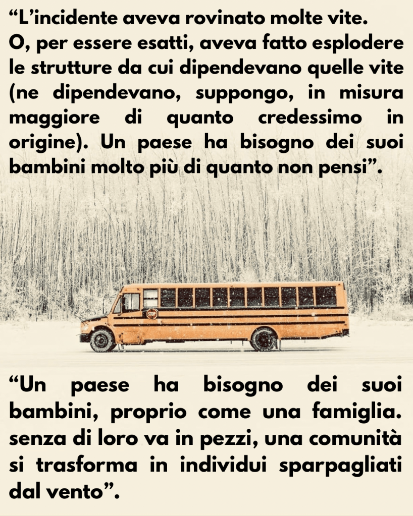 Il fulcro della trama risiede in un drammatico incidente che coinvolge uno scuolabus: da qui si dipana un intreccio a più voci in cui si compenetrano dramma collettivo e abissi privati di ogni personaggio. Lo sprofondare della comunità e quello dell’individuo si fondono a comporre l’inevitabile sorte della natura umana: la sofferenza.